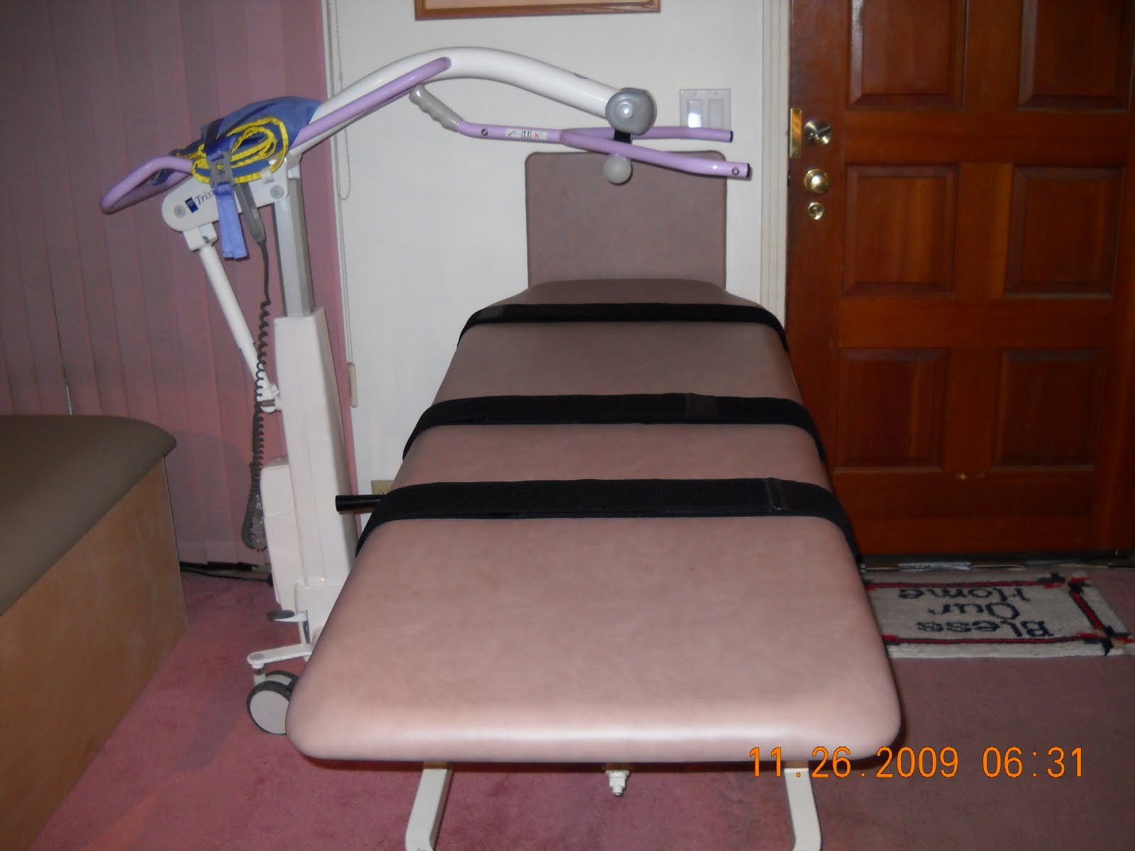 The tilt table, generously donated for use by Ryne Spitzer’s mom and dad, raised to a 30-inch height by Phil Atchison is placed and ready for use. The new 4x7 mat table, designed by me to go over the antique coffee table was built by Better Builders Inc and upholstered by Ernie’s Custom Upholstery has become Maverick’s new bed and “crows nest” for watching out the front window was delivered on Thanksgiving Day.
